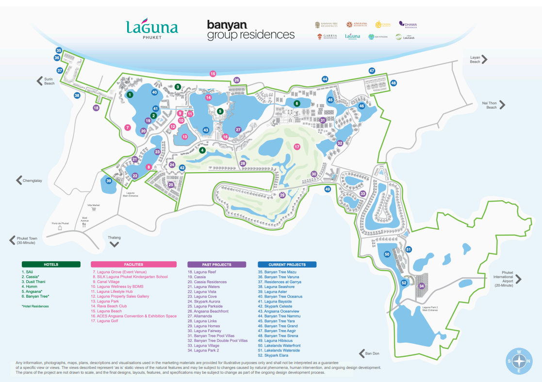 Планировочные площади от 67 до 297 м² в зависимости от формата — студия/1,2-спальни до больших пентхаусов. Проект расположен в элитном районе Чонг Тале Laguna Phuket, среди гольф-поля, садов и зеленых насаждений.