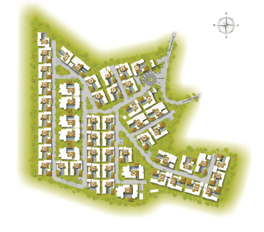 Каждый дом оснащен просторным салоном с коническим потолком, интегрированной кухонной зоной с барной стойкой, широкими витражами для проникновения дневного света, персональным водоемом, благоустроенным парком и навесом для двух транспортных средств. Планировка предусматривает обеденную область в открытом формате, подсобное помещение, зону для стирки, персональные санузлы в каждой комнате.