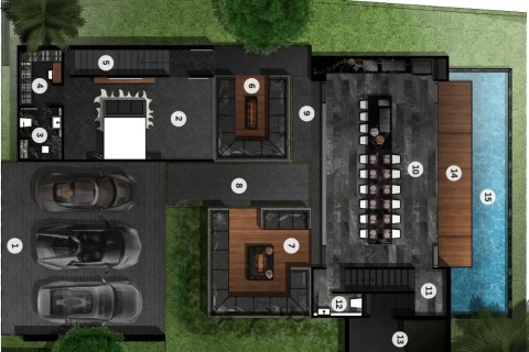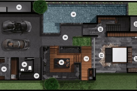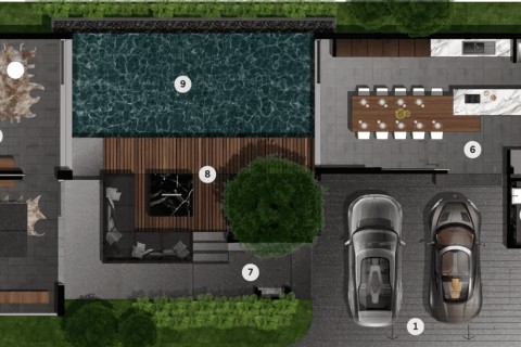 - Комфортные аспекты: Собственный бассейн и двор во всех виллах, мраморная текстура материалов.