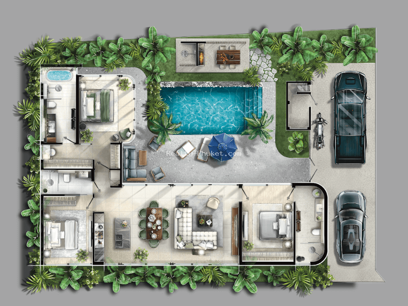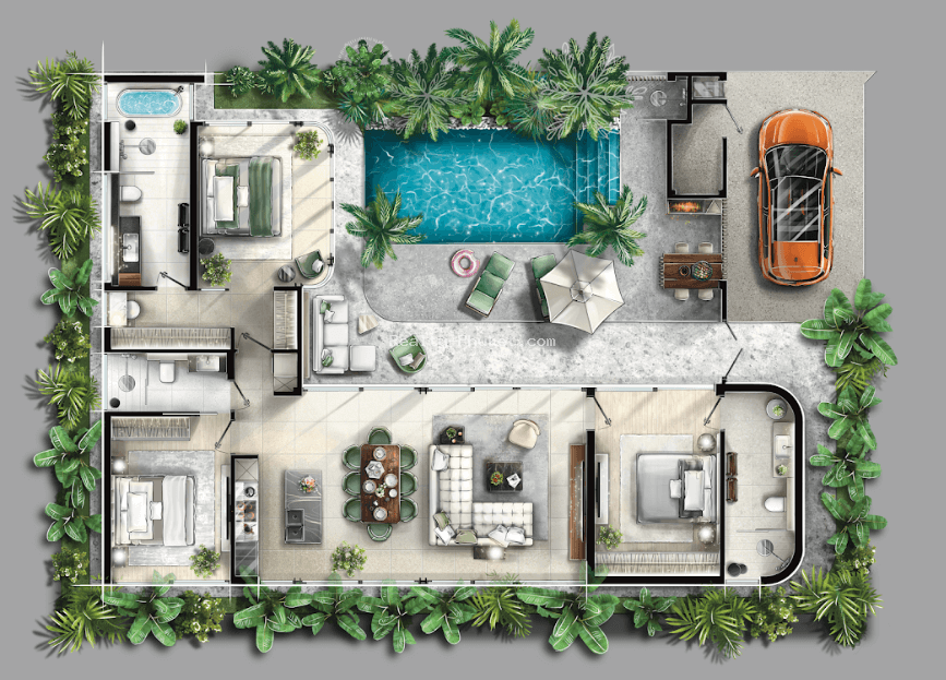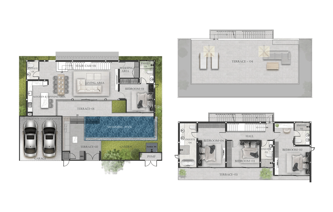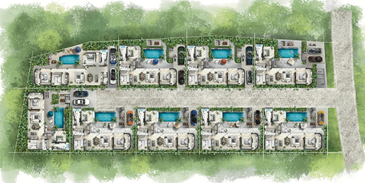 Площади вилл от 327 до 473 квадратных метров, обеспечивают простор для четырех спален с ванными, гостиной открытой планировки и современной кухней.