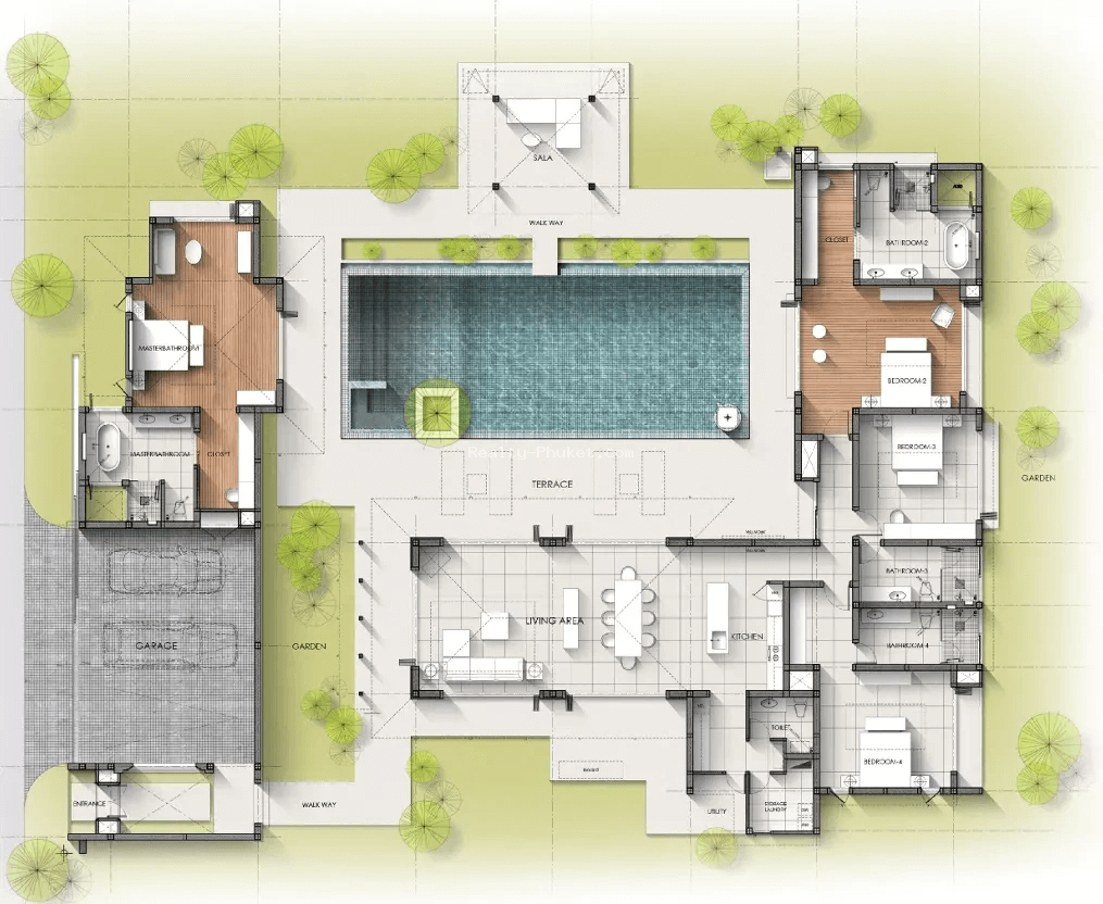 - Каждая вилла оснащена частным бассейном длиной 11,5–15 метров, террасой у бассейна, ландшафтным садом и салой для отдыха, крытой парковкой на 2–3 автомобиля.