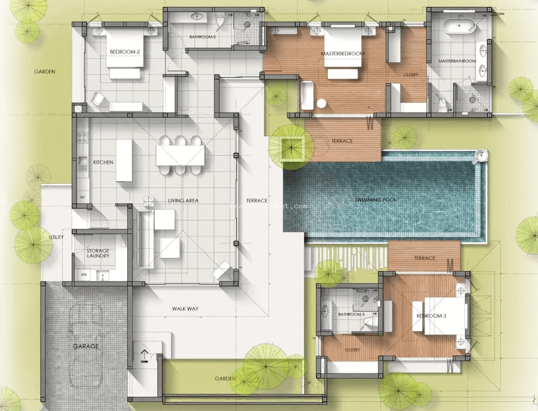Высококачественные материалы. Канадская кедровая кровля, испанский зеленый сланец, тиковое дерево и травертиновый мрамор применяются для создания роскошных поверхностей. Кварцевые плиты формируют прочные столешницы, устойчивые к царапинам. Кухонные комплексы от бренда Absolute, сочетающие функциональность с современным дизайном. Помимо этого, в виллах есть: