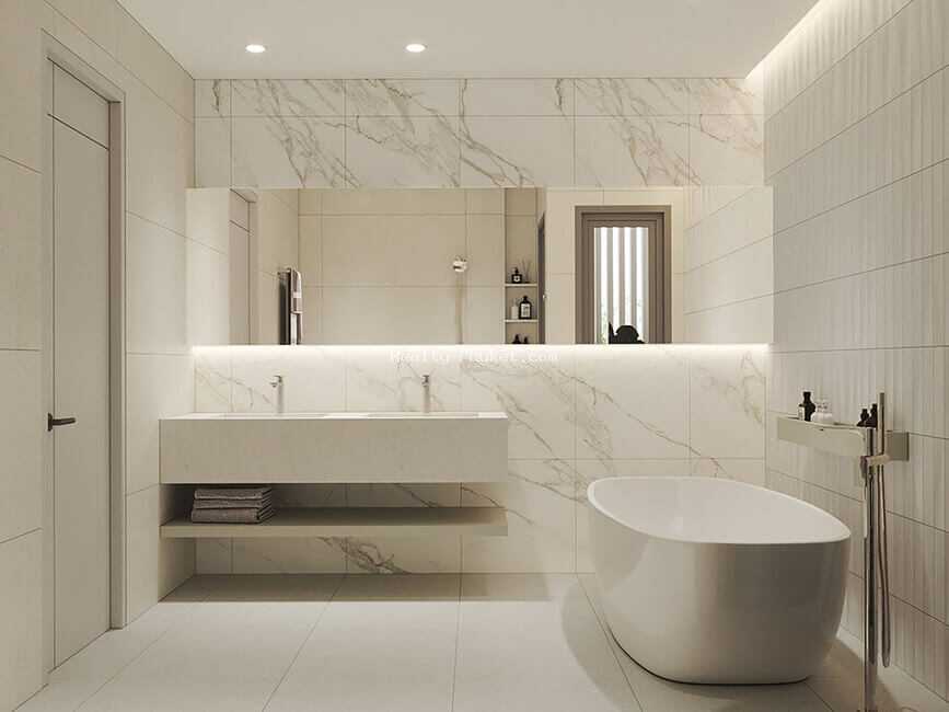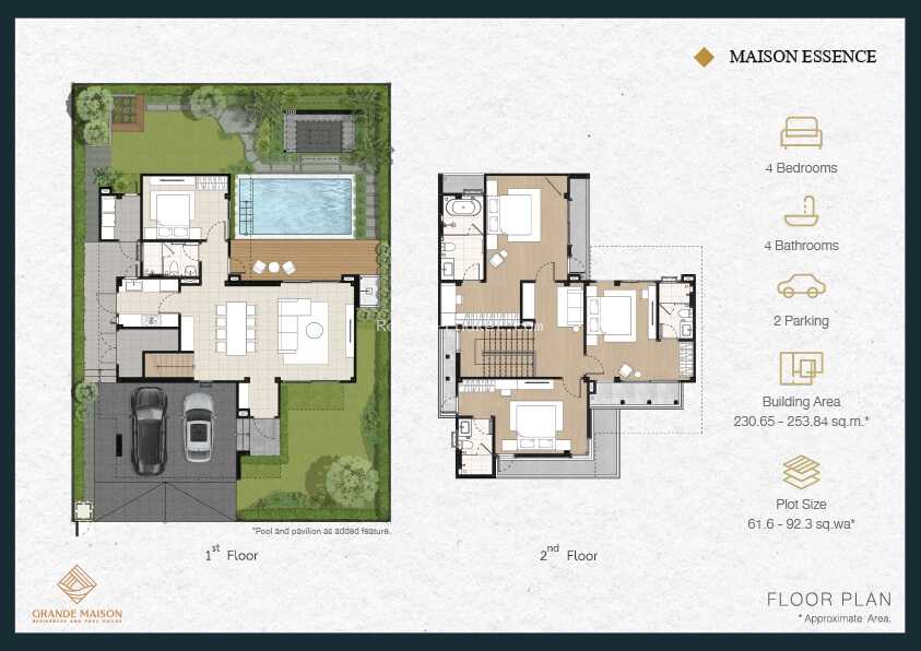 - Maison Essence, с площадью здания 230,65–253,84 кв. м и участком 61,6–92,3 кв. м, предусмотрены 4 спальни и 4 ванные комнаты, включая ванну. Открытая гостиная плавно переходит в террасу у бассейна.
