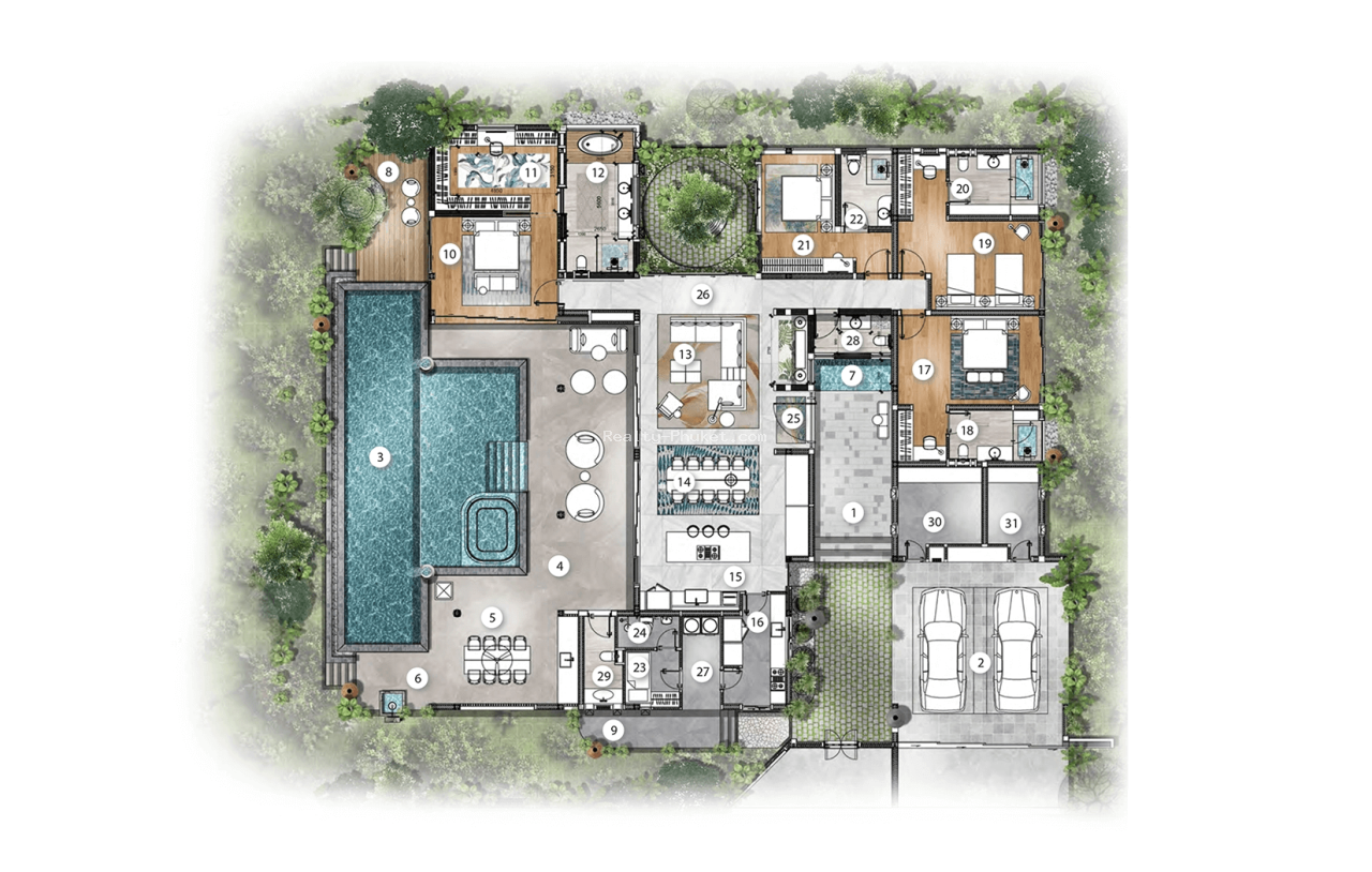 - Приватность и комфорт: Ландшафтные сады с шезлонгами и салами для открытых обедов.