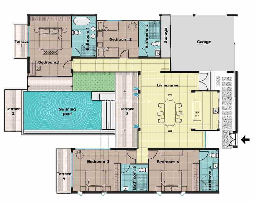 - Комфорт проживания усиливается благодаря интеграции с природными элементами, включая безмятежное озеро в общей зоне.