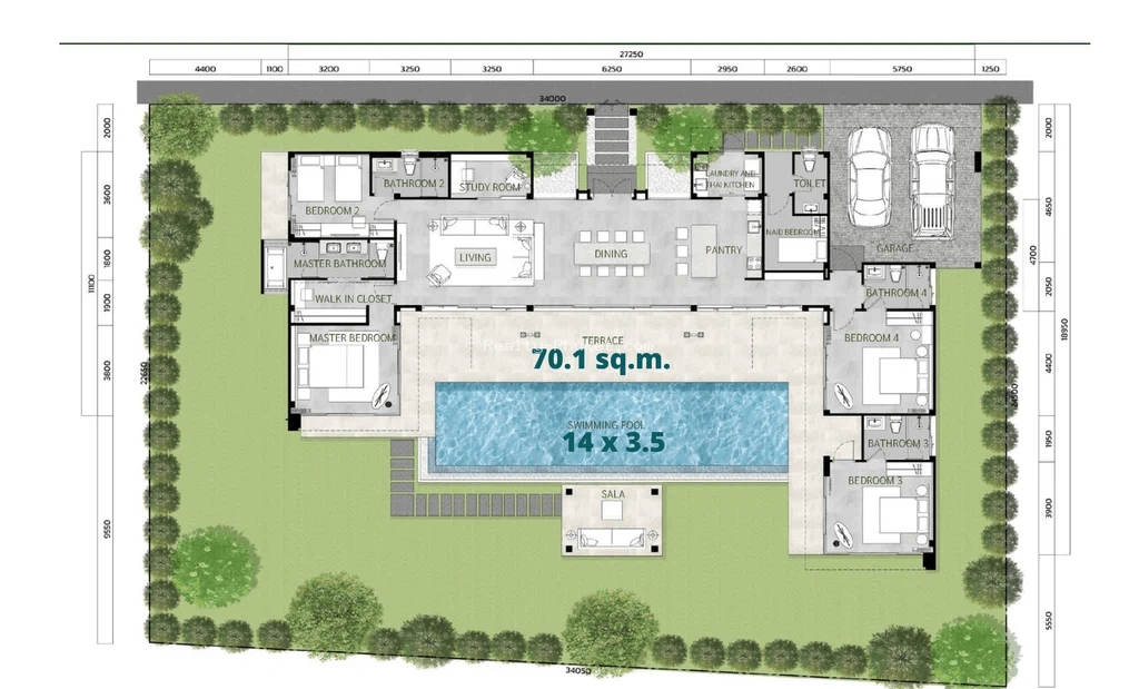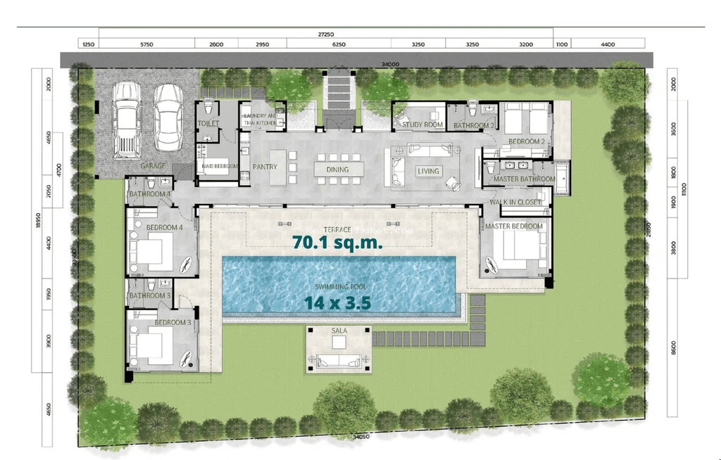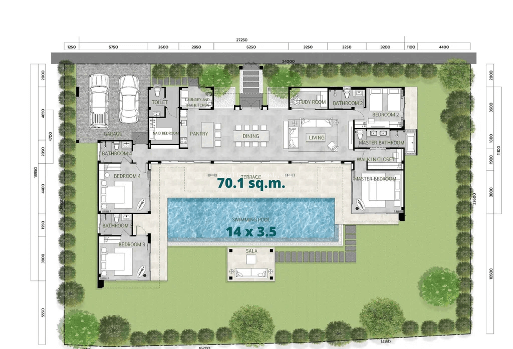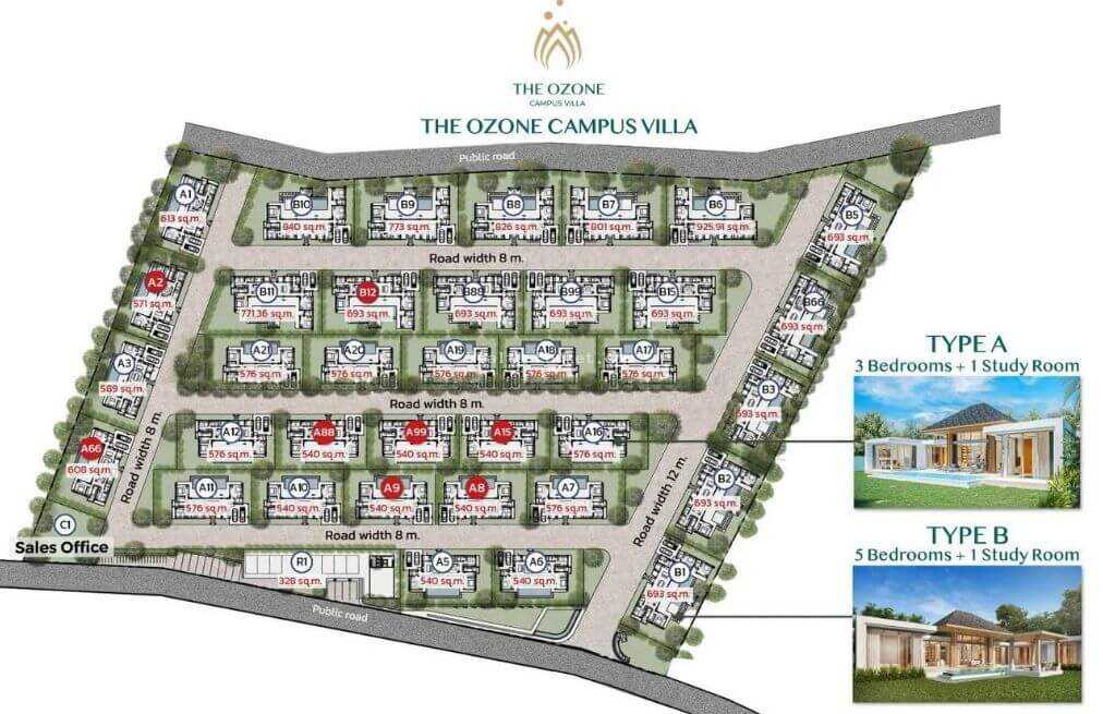 Виллы в комплексе The Ozone Campus Villa отличаются просторными планировками с открытой концепцией и высокими потолками, где первый уровень объединяет гостиную, столовую и кухню с барным островом. Две кухонные зоны (основная и дополнительная) оснащены современной техникой, включая барную стойку. Гостевые спальни с ванными комнатами выходят на террасу у бассейна (размерами до 3,5x12,7 м), с навесом и уличным душем. Второй этаж включает главную спальню с гардеробной, балконом и кабинетом, ведущим на крышу. Комната для обслуживающего персонала добавляет практичности. Преимущества: